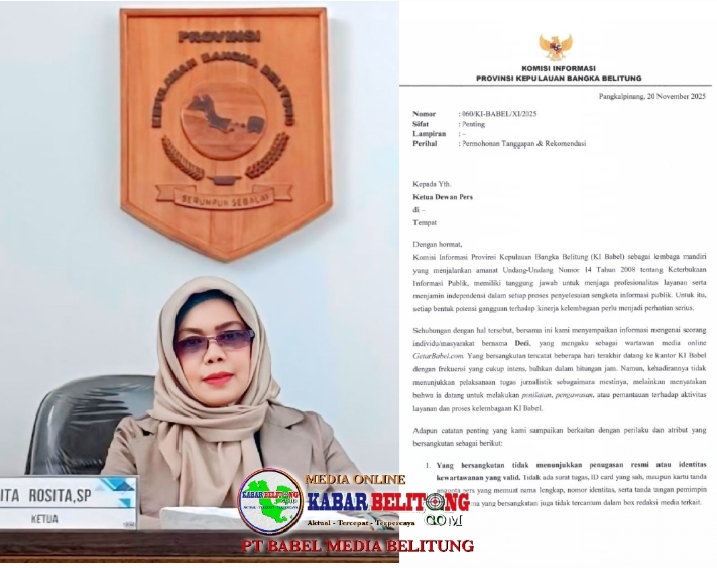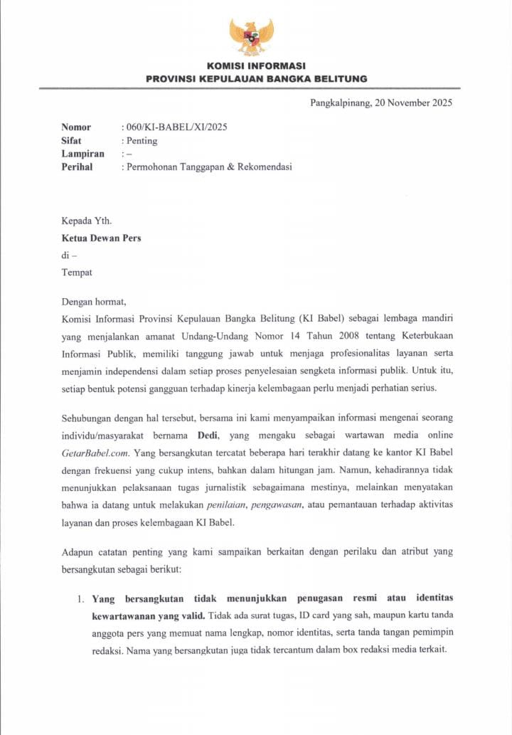 Pangkalpinang, kabarbelitung.com – Komisi Informasi Provinsi Kepulauan Bangka Belitung (KI Babel) akhirnya mengambil langkah resmi dengan melayangkan surat kepada Dewan Pers terkait keberadaan seorang individu bernama Dedi, yang mengaku sebagai wartawan media online GetarBabel.com. Jum’at (21/11/2025).