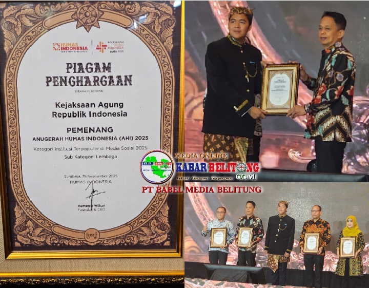 Surabaya, kabarbelitung.com – Kejaksaan Agung menerima piagam penghargaan dari HUMAS INDONESIA Indonesia Group karena terpilih sebagai “Institusi Terpopuler di Media Sosial 2025” dalam acara Anugerah HUMAS INDONESIA (AHI) yang digelar pada Kamis 25 September 2025 di JW Marriott Hotel Surabaya.