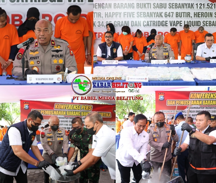 Riau, kabarbelitung.com – Kepolisian Daerah (Polda) Riau memusnahkan narkoba berbagai jenis senilai Rp 123,7 miliar. Narkoba tersebut disita polisi selama 3 bulan operasi. Rabu (27/08/2025).